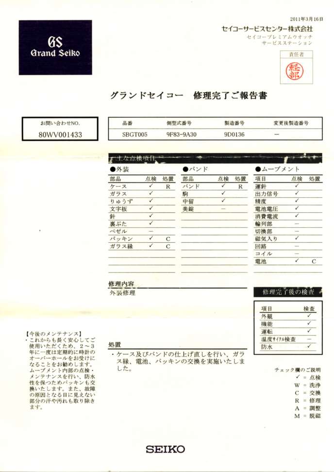 投稿日: 2020年5月2日2020年5月2日 投稿者: takaharuWatches修理 2020/05/02 電池交換と完全O/H 電池交換にあわせて初めてのO/H。すっきりして帰ってきました。今回の修理内容。 過去の修理履歴は下。