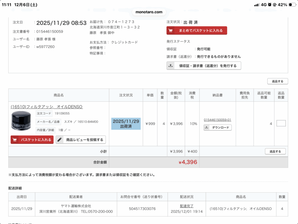 エンジンオイル交換。オイルフィルター交換、ルブロイド添加。今回フィルターはモノタロウからの購入。