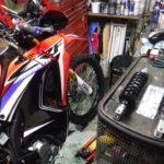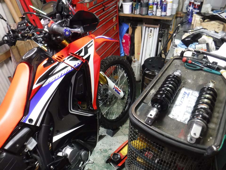 リヤダンパー交換。跨いだだけですが、250Mより柔らかい。フロントはノーマルに比べてふにゃふにゃ感はなくなった。リヤはノーマルより少し堅くなった程度、初期沈み込みが減ったくらい。走行が楽しみ。。。。。