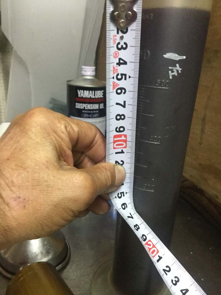オイルはヤマハPG-10とPG-15を1:1に混合しておそらくPG-12.5になっているはず。オイルレベルはTGRスプリングのRALLY向け推奨レベルバネ入る側(右)150mm、ダンパー側(左)45mmにしています。関連部品の交換は無し。わかりにくいが左端の写真は「左」の表記を無視して右側フォークから抜き取ったオイルレベルがスケールの実測(640CC)。真ん中の写真はオイルレベルは右側フォークのだが、「左」マークの高さに注目(540cc)
